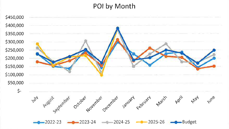As of December 2025, the POI, or percentage of income, for the month totaled $384,501 just under the budgeted amount of $384,556. The year-to-date POI through December 2025 was $1,357,642 and was $71,854 lower than the Fiscal Year 2026 budget of $1,429,496.