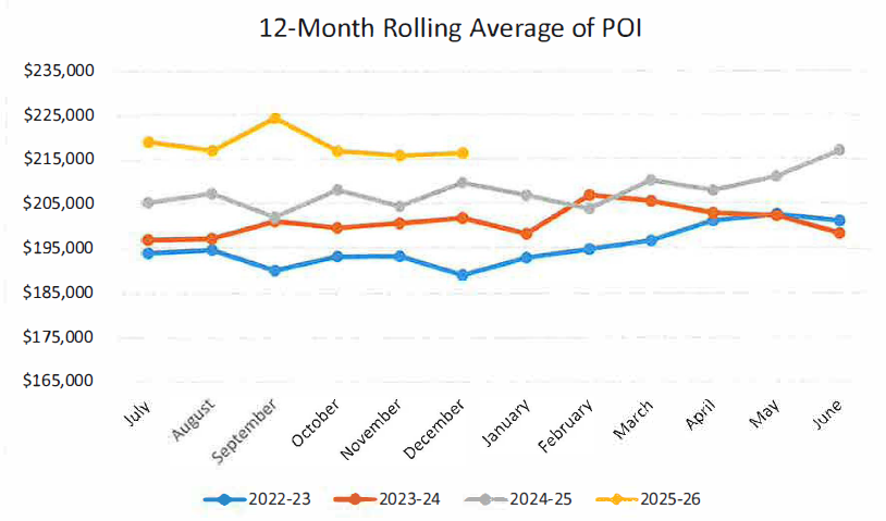 The 12-month rolling average for POI is $216,317 – 3.2% higher than the rolling average as of December 2024.