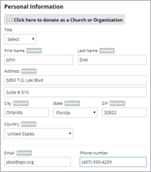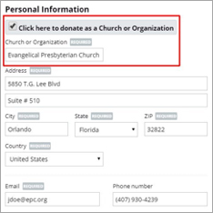 If you are donating as a church or other organization, you must check “Click here to donate as a Church or Organization” and enter your church or organization name.